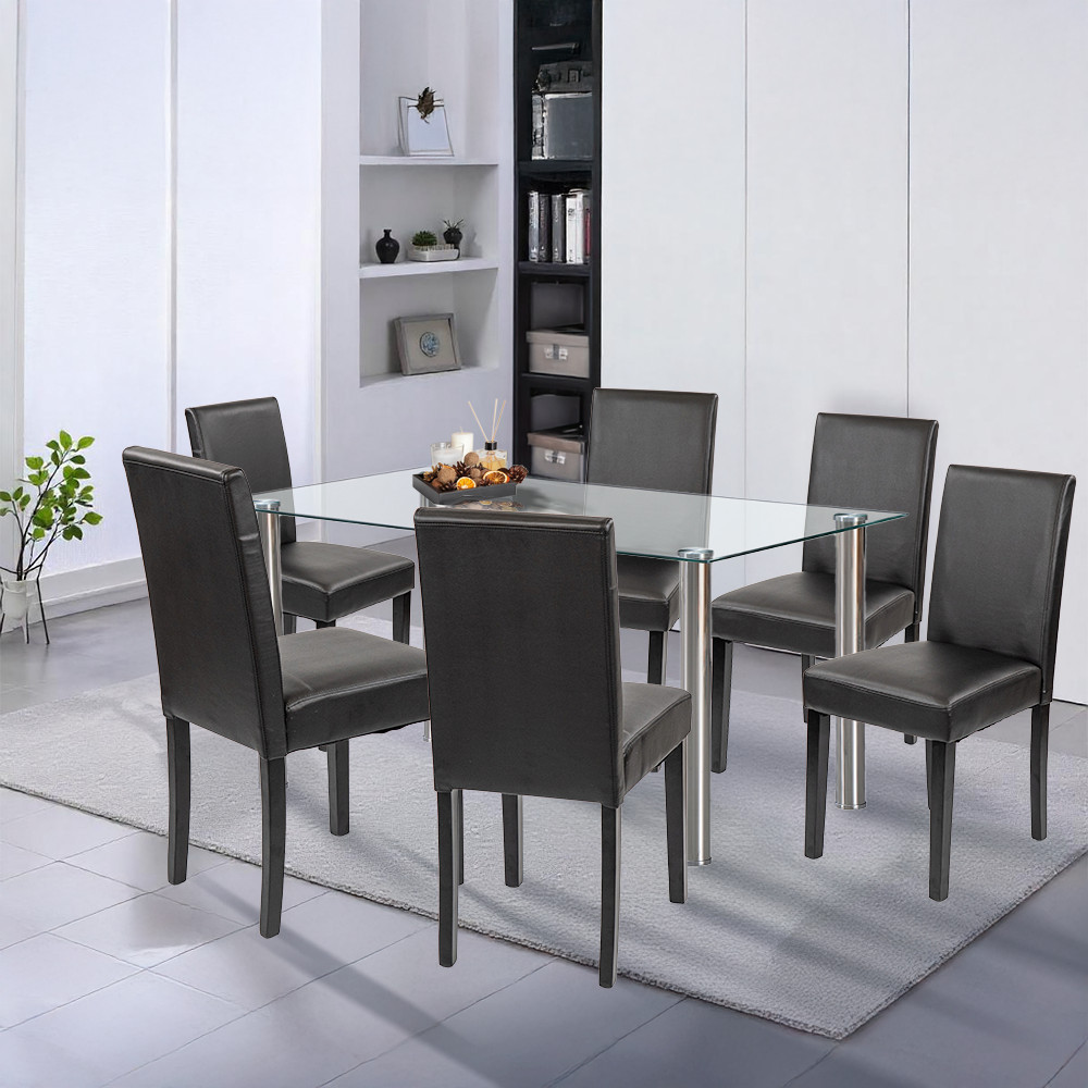A szett hat darab Leziter Kelly széket is tartalmaz, amelyek fekete ECO bőr kárpitozással készültek. Az elegáns megjelenés mellett ezek a székek rendkívül könnyen tisztíthatók. A 4 cm vastag habszivacs ülőfelület hosszabb étkezések során is komfortot nyújt, a stabil fenyőfa lábak pedig 120 kg teherbírással garantálják a hosszú távú megbízhatóságot.