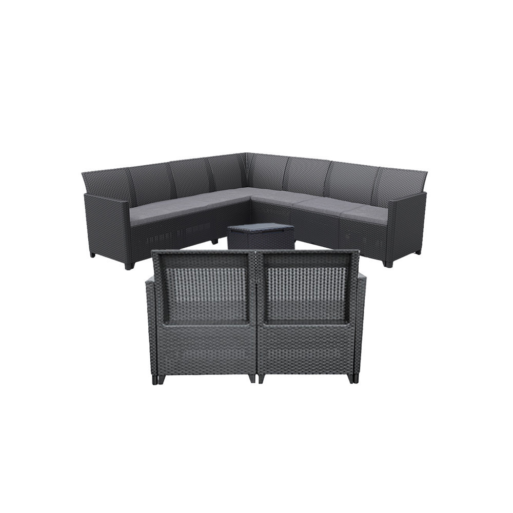 Ez a Grafit színű rattan hatású kerti bútor szett két fotellel, egy 9 személyes sarokkanapéval, egy 2 személyes kanapéval és egy tárolós asztallal rendelkezik, amelyeket időjárásálló műanyagból készítettek, így nem kell aggódnod a UV sugárzás hatásaitól sem. A kanapé magassága: 74 cm, szélessége: 113 cm, hossza: 65 cm. A kanapé párnával rendelkezik, mely kényelmessé teszi és színben passzol a bútorhoz. Az asztal magassága: 37 cm, szélessége: 37 cm, hossza: 37. Az asztal több funkciós, így a tároló részében elrejtheted a kerti eszközöket.