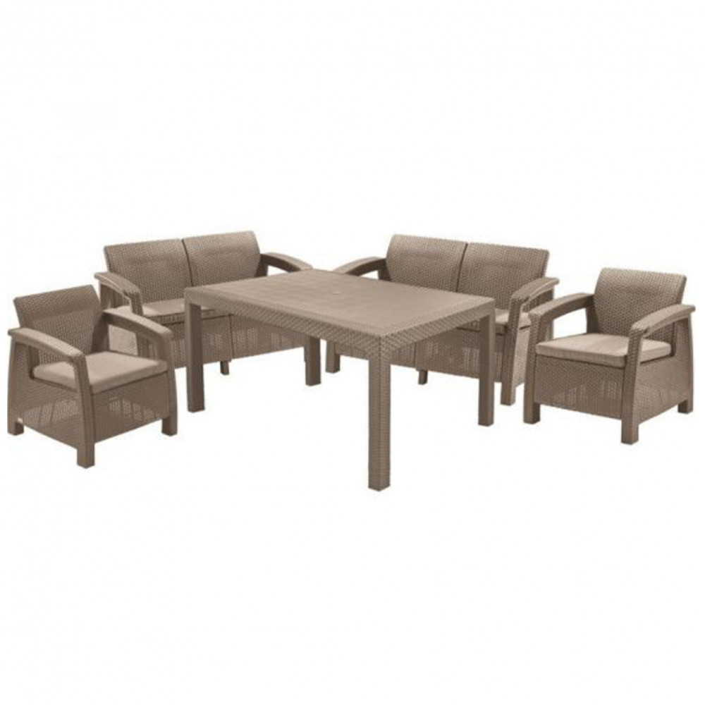 A Corfu Fiesta kerti bútorai nagyon tartós műanyagból, polipropilénből készülnek. Nagy ellenállást biztosítanak a víz és az UV sugárzás ellen. További előnye még, hogy könnyű és tartós. A párnahuzatoknak megnövelt vízállósága is van, csak nagyobb esőzések esetén el kell rejteni.