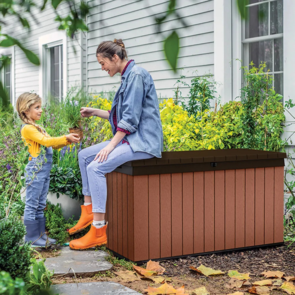 Darwin kerti tároló - praktikus - tökéletes kerti szerszámok és játékok tárolására. A fa textúrájú külső stílusos kinézetet kölcsönöz, tökéletesen beleillik a kert kinézetébe. A láda tartós és az időjárási viszonyoknak ellenálló szerkezetén nem fog sem a rozsda, sem a fizikai sérülés sem a penész - sok éves használat után is ugyanolyan szépen fog kinézni. Az oldalsó fogantyúk lehetővé teszik a mozgatást, a zárható fedél pedig megvédi a benne lévő tartalmat.