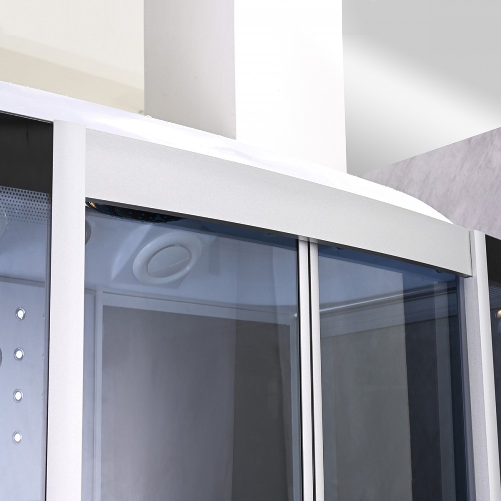A kabint 5 mm vastag edzett biztonsági üveg veszi körül, amely sötétszürke fix üveg- és ajtópanelekkel, illetve fekete üvegfalakkal fokozza az esztétikai megjelenést. A matt króm vezetősínek és profilok tovább emelik a termék eleganciáját, míg a matt króm funkciópanel a vezérlési lehetőségek középpontjában áll. A kabin 6 hidromasszázs fúvókával rendelkezik, amely garantálja az egész testet átölelő masszázsélményt, miközben a beépített rádió, ventilátor, LED háttérvilágítás és felső világítás tovább fokozza a relaxáció élményét.