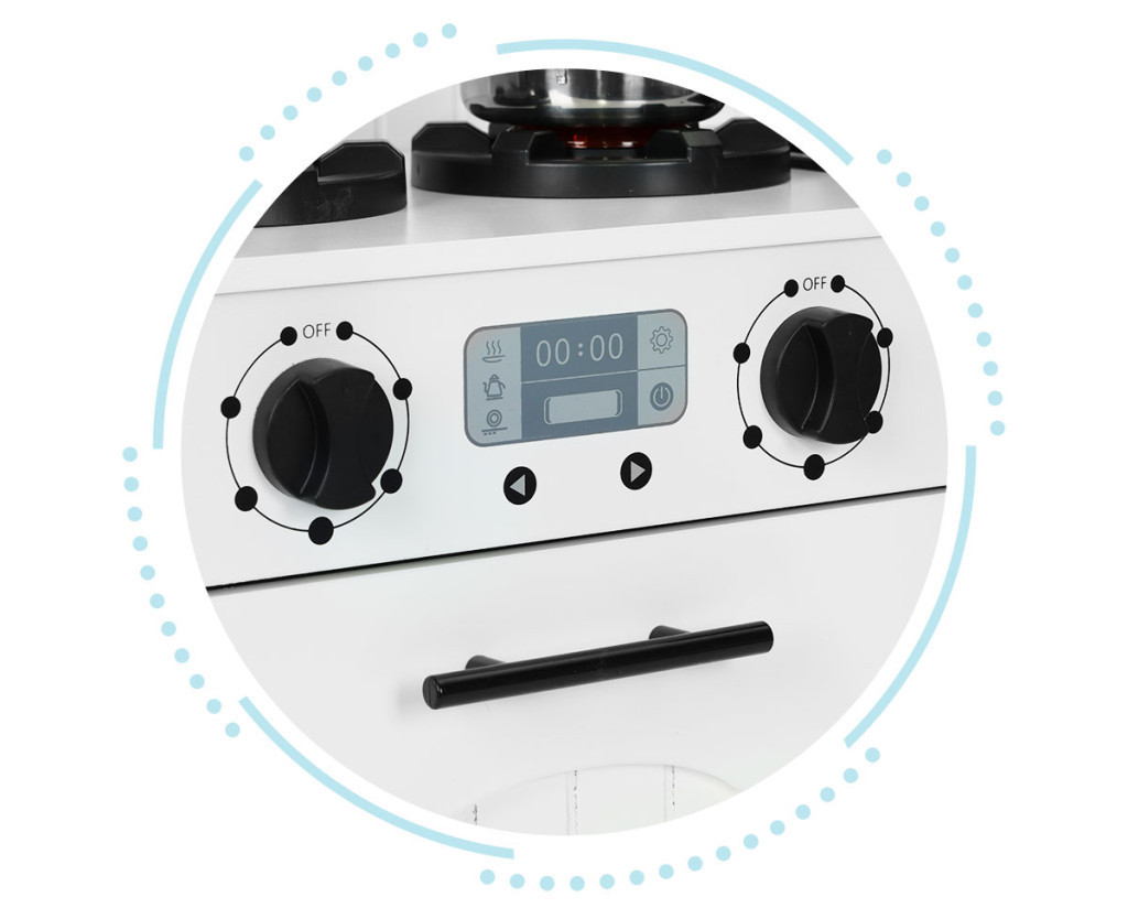 A konyha forgatógombokkal van felszerelve, amelyek lehetővé teszik a tűzhely és a sütő működésének szimulálását. A gyerekek szabályozhatják a hőmérsékletet, megváltoztathatják az égőfej beállításait, ami lehetővé teszi számukra, hogy különböző forgatókönyveket alkossanak és játéktányérokat készítsenek, anélkül, hogy veszélybe kerülnének égetés. Ez egy nagyszerű lehetőség a kreatív játékra és kísérletezésre egy biztonságos környezetben.