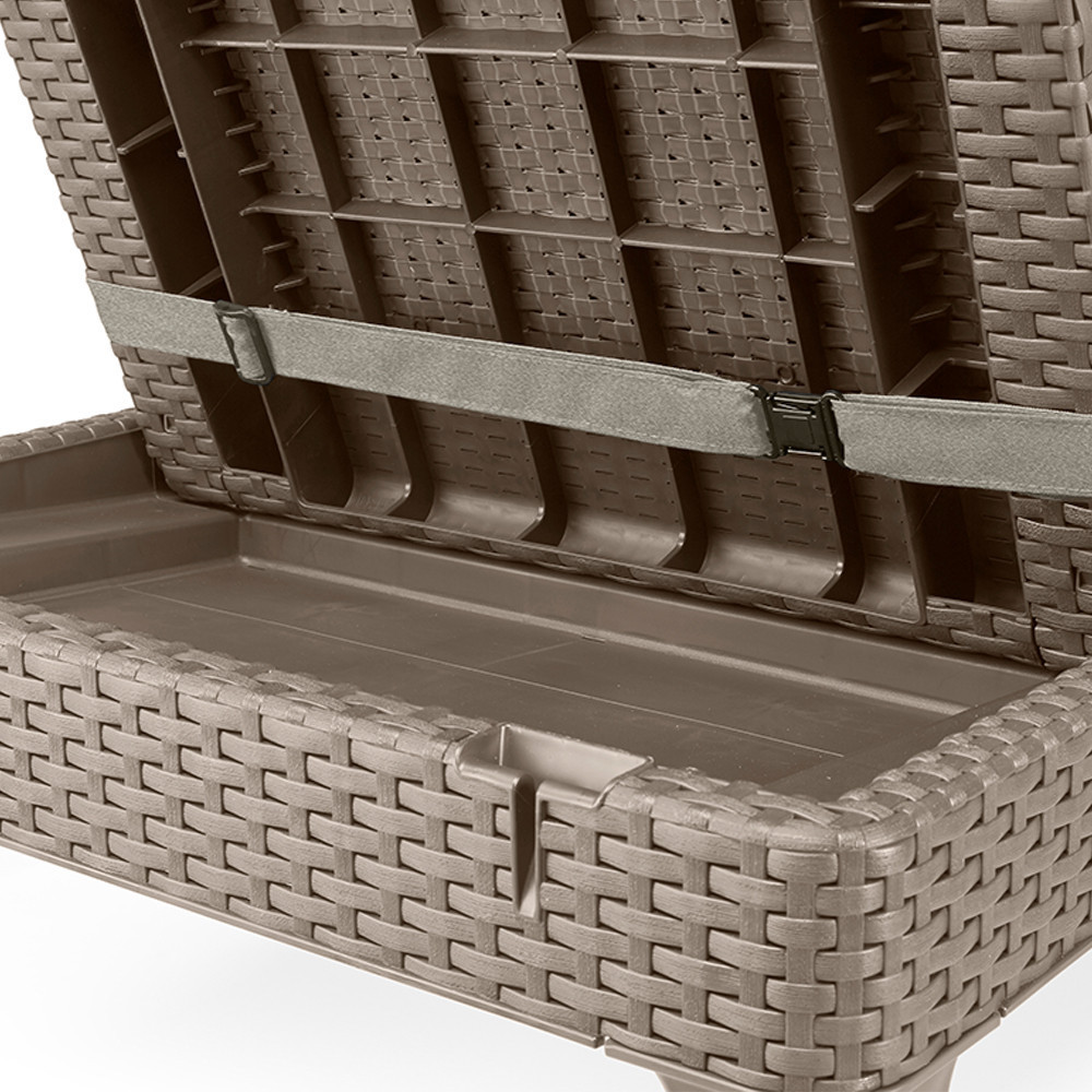 - A műanyag anyagból készült, de természetes rattanra emlékeztető felületkialakítás eleganciát kölcsönöz, miközben strapabíró és tartós marad.