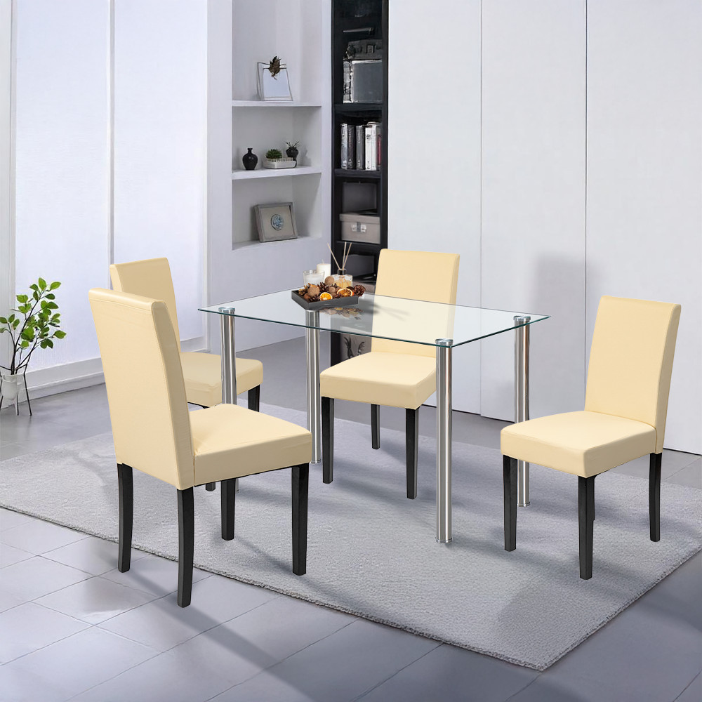 A szett négy darab Leziter Kelly széket is tartalmaz, amelyek bézs ECO bőr kárpitozással készültek. Az elegáns megjelenés mellett ezek a székek rendkívül könnyen tisztíthatók. A 4 cm vastag habszivacs ülőfelület hosszabb étkezések során is komfortot nyújt, a stabil fenyőfa lábak pedig 120 kg teherbírással garantálják a hosszú távú megbízhatóságot.