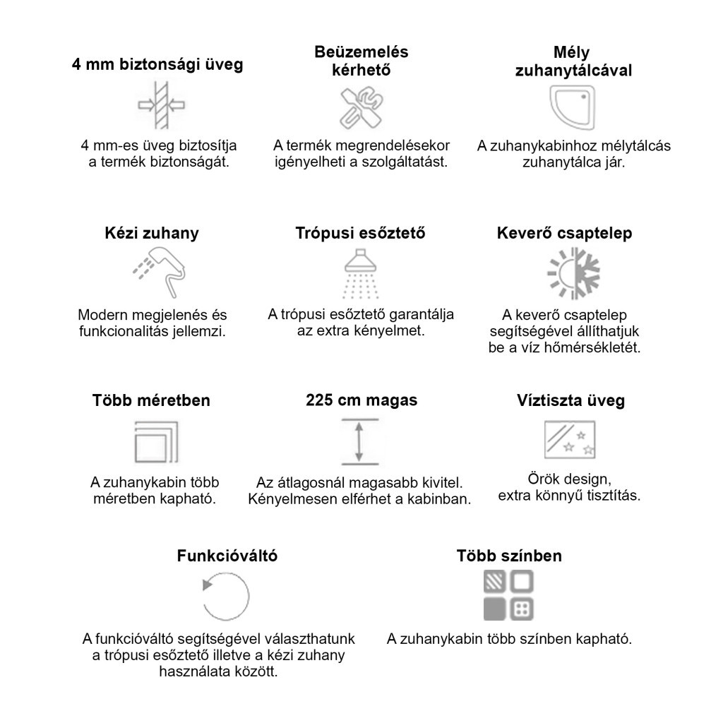 - Felszereltség: Trópusi esőztető, kézi zuhany, keverő csaptelep, funkcióváltó, mágneses ajtózár, beépített ülőke