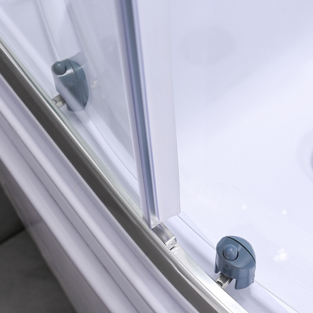 A krómozott alumínium profilok stabil szerkezetet adnak, a fém fogantyú pedig kényelmes fogást biztosít minden használat során. A 225 cm-es teljes magasság tágas belső teret eredményez a megszokottnál magasabb kabinok kedvelőinek.