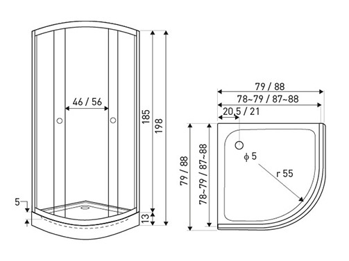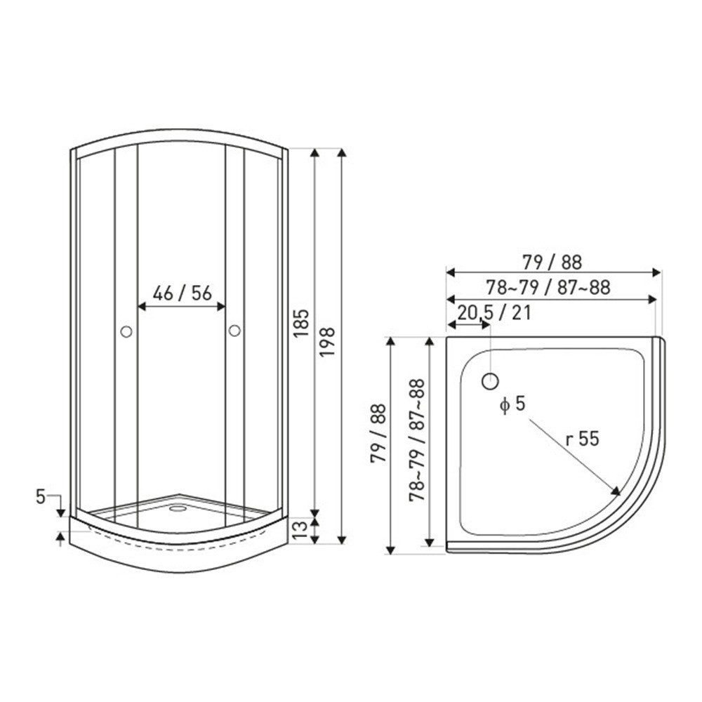 A zuhanykabin 4 mm-es edzett üvegből készült és biztonsági üveggel van ellátva. A zuhanykabin íves kivitelben kapható. Dupla görgős ajtókkal van ellátva. A kabin 80x80x185 cm méretű (teljes magassága tálcával: 198 cm). A fehér akril zuhanytálca 79x79x13 cm!