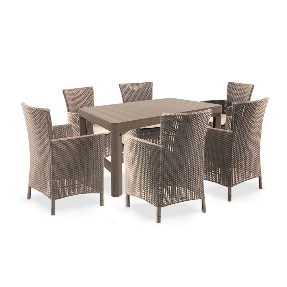 Az Liowa 6+1 kerti bútor garnitúra tökéletes választás bármely kertbe, teraszra. Egyszerű, de még is modern ami még különlegesebbé teszi a szettett. Ellenáll a szélsőséges időjárásoknak ezért éveken keresztül megörzi eredeti formáját. A szett nem igényel különleges karbantartást vagy tisztítást. Ajánlott áztatott puha törlőrongy segítségével áttőrölni.