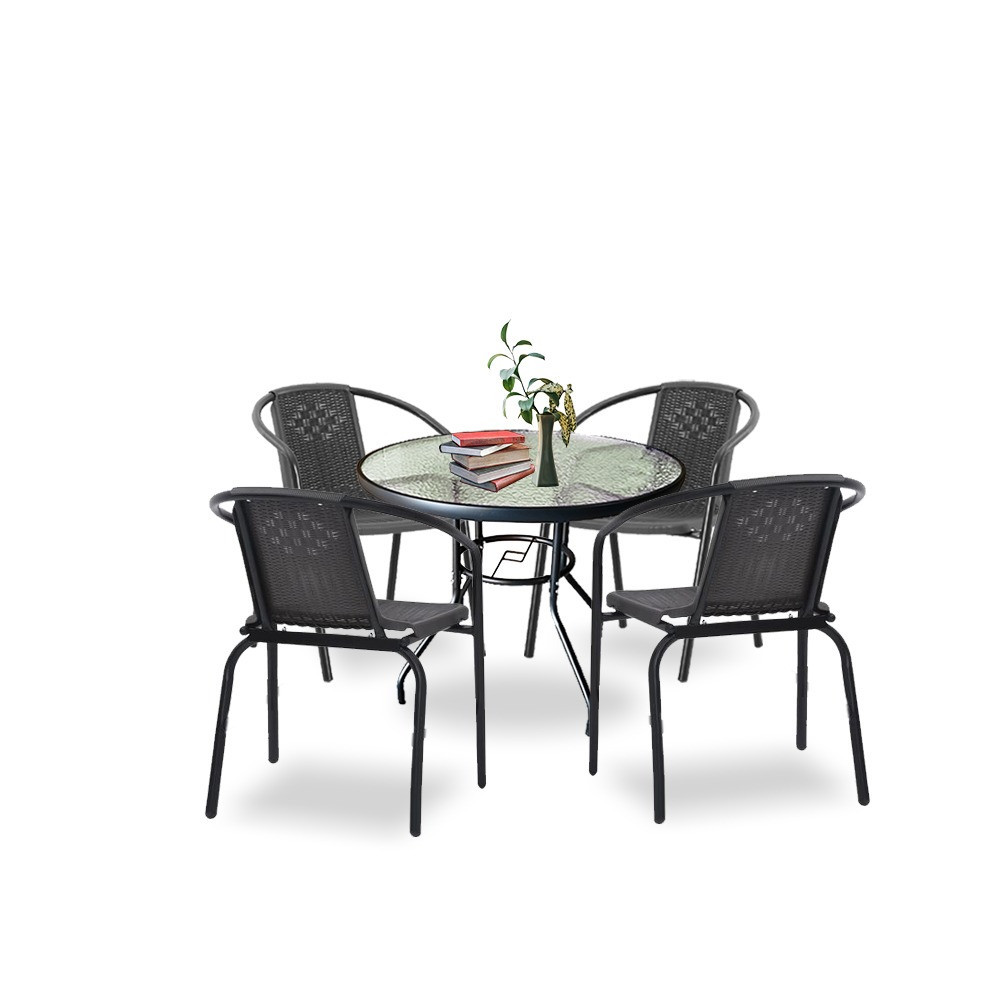 A modern kivitelű kerti bútorkészlet egy kerti üveglapos asztalt és 4 széket tartalmaz. A bútorokat 4 fő számára tervezték. A székek és az asztal lábazata acélból készül. Az asztallap 5 mm-es edzett üvegből készült, amely ellenáll a kisebb karcolásoknak. A műanyag szék ülésanyaga ellenáll az időjárási viszonyoknak. Előnye az ergonómikusan profilált ülés és karfa, amelyek tehermentesítik a vállakat pihenés közben.