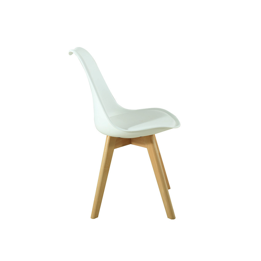 - Elegáns design: fehér színű, polipropilén ülőfelület és fehér PVC párnázat, természetes bükkfa színű lábakkal. Modern és elegáns megjelenés.