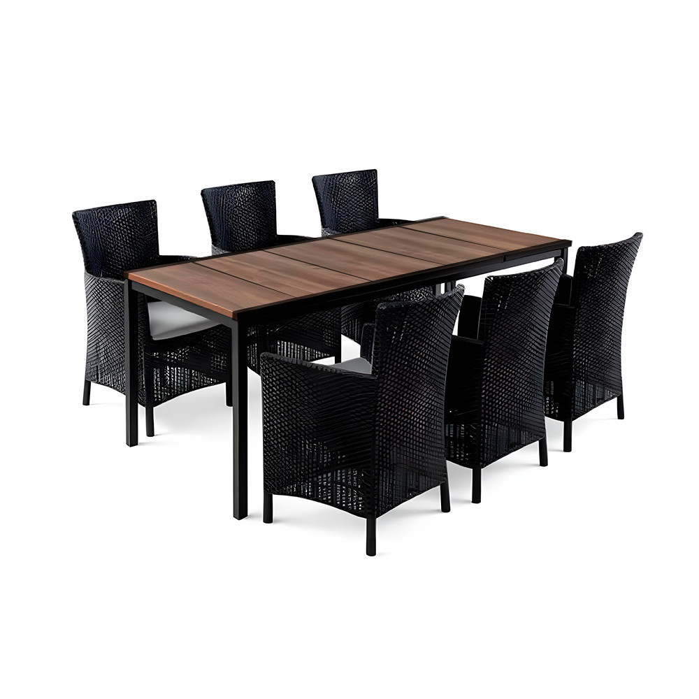 A Nadia Large garnitúrában minden benne van, ami egy gondtalan kültéri étkezéshez, nyári estéhez vagy baráti összejövetelhez kell. A hat darab kényelmes, kartámaszos Iowa fotelhez egy tágas, 200 × 95 cm-es Porto étkezőasztal tartozik – mindez időjárásálló, UV-védett, stílusos kivitelben.