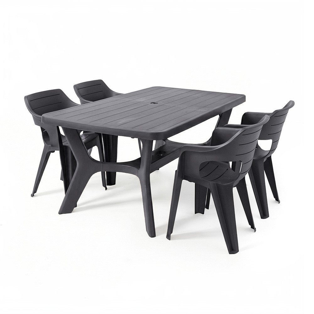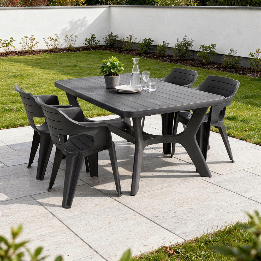 A Natalie 4+1 kerti bútor garnitúra szett grafit színben praktikus és látványos megoldás, ha modern, kényelmes és jól terhelhető kerti étkezőszettet keresel.
