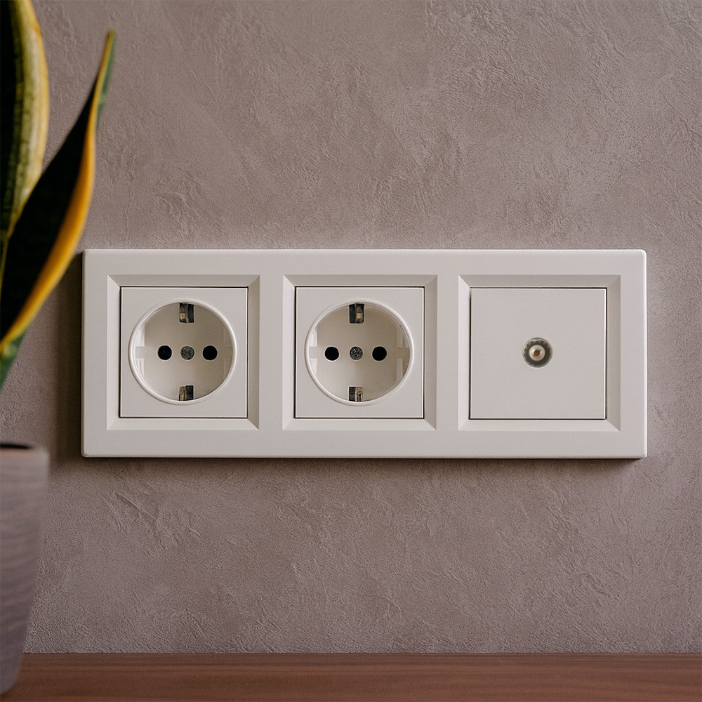 - Típus: Kettős földelt csatlakozóaljzat (dugalj) 2P+F, F típus + 1 × TV RF csatlakozó