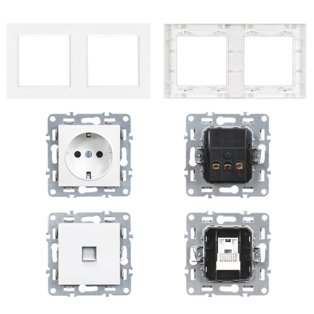 A termék két keret nélküli modulból áll (földelt dugalj + UTP aljzat), melyek gyárilag be vannak építve egy fehér Nova vízszintes 2-es keretbe. A lekerekített forma, az egységes színvilág és a kompakt méret garantálják a harmonikus, modern megjelenést. A süllyesztett kialakítás révén a szerelvény diszkréten simul a falba, így vizuálisan is igényes megoldást kínál.