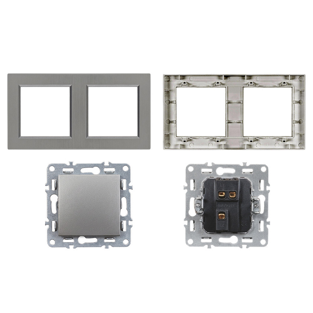 A váltókapcsoló süllyesztett kivitelben készül, így esztétikusan illeszkedik a fal síkjába. A dupla szürke keret lekerekített peremével modern, mégis visszafogott megjelenést biztosít, amely bármilyen enteriőrbe könnyedén beilleszthető. A kapcsolók működése precíz és finoman érezhető – egyértelmű visszajelzést ad minden kapcsoláskor.