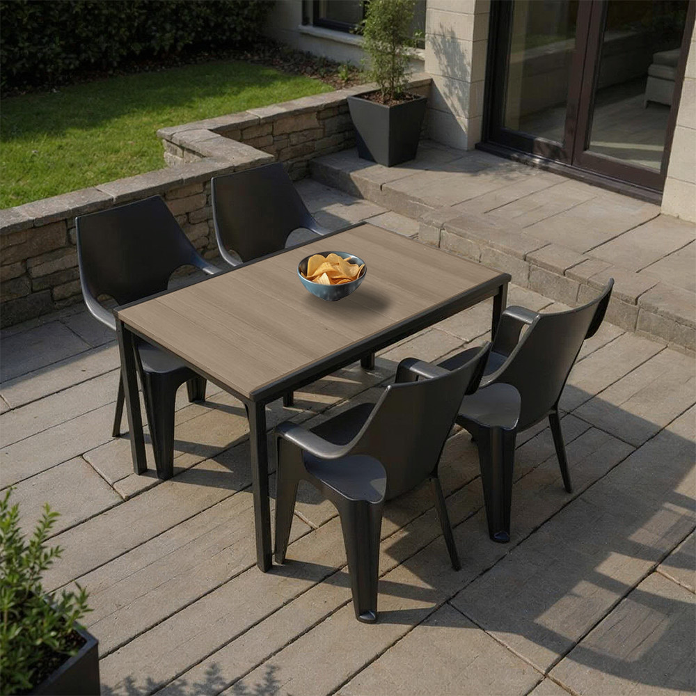 A Parker 4+1 Kerti Bútor Garnitúra Szett minden darabja prémium minőségű, időjárásálló anyagokból készült, melyek biztosítják a hosszú távú használatot és a könnyű karbantartást. Az asztallap műanyagból készült, de a DecoCoat™ technológia alkalmazásával fa hatású megjelenést kapott, így nemcsak esztétikailag hasonlít a valódi fához, hanem karcálló és UV-álló is. Ezáltal nem kell aggódnod, hogy az időjárás vagy a napi használat miatt gyorsan elhasználódik.