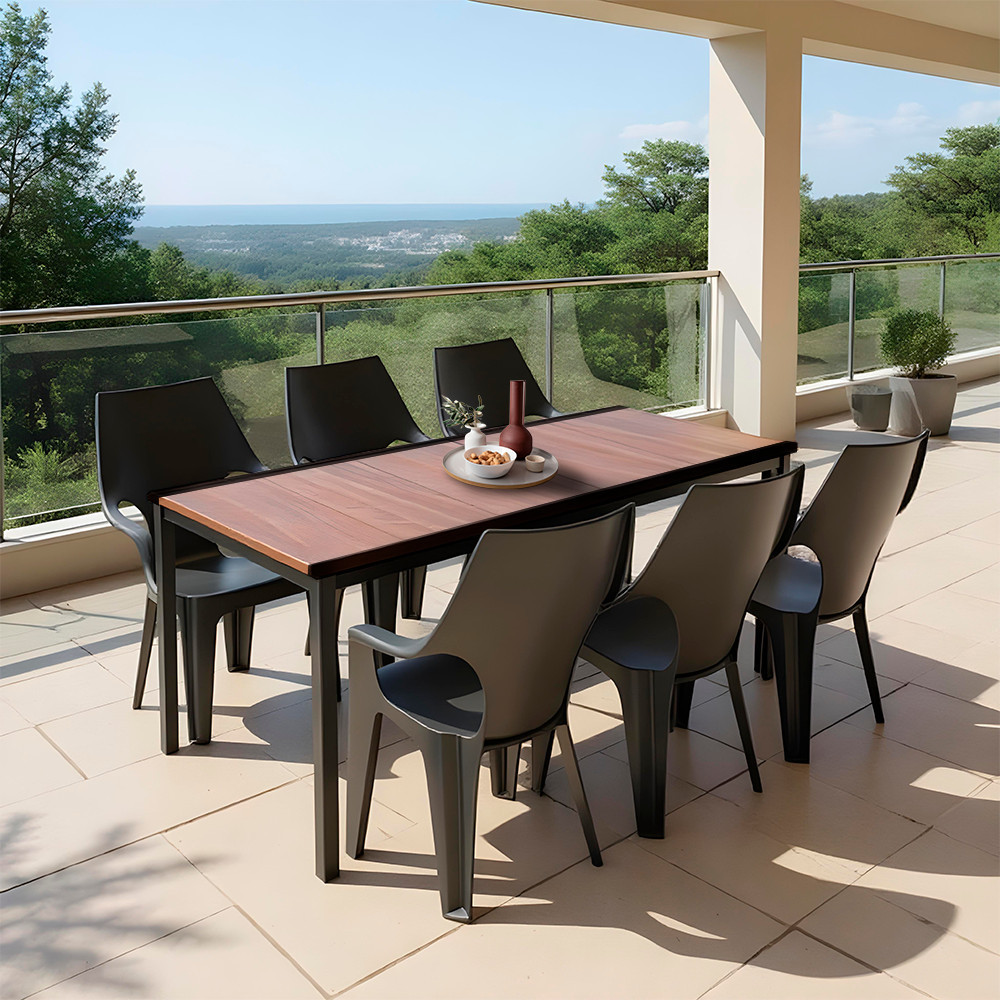 Minden, ami a hétvégi, ráérős brunch-tól a baráti grillpartiig kell: hat Dante magas támlás kartámaszos szék + egy 200 × 95 cm-es Porto étkezőasztal – prémium műanyagból, kompromisszumok nélküli kényelemmel és nulla karbantartással.