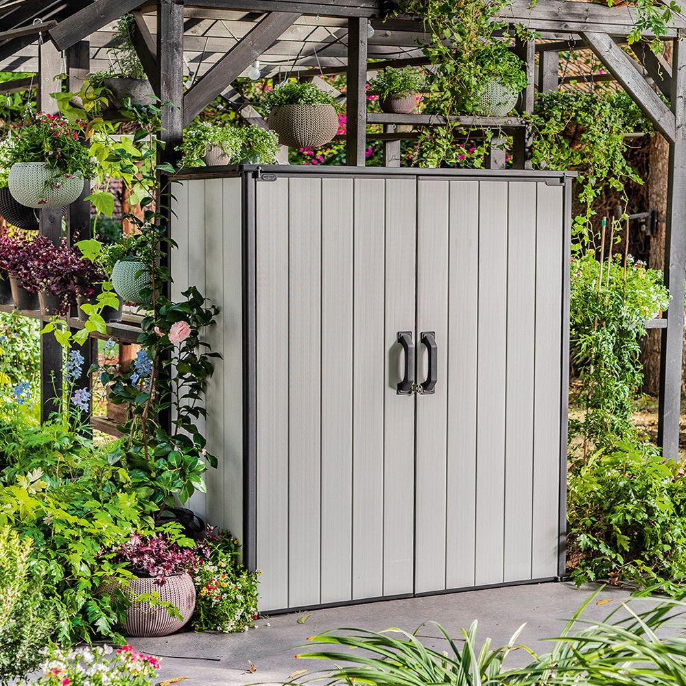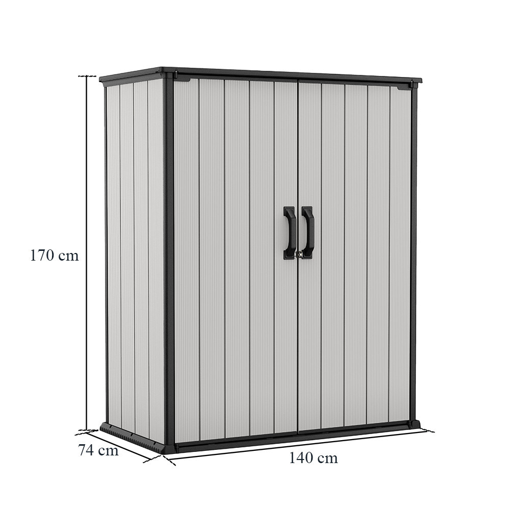 A Keter High Store kerti tároló dupla ajtaja reteszzárral rendelkezik. Elég, ha saját kezűleg vásárol egy lakatot, hogy megvédje a szekrényt a nemkívánatos felhasználóktól. A Kete High Store karbantartásmentes egész évben. A tisztításhoz vizet és enyhe tisztítószereket használhatsz.
