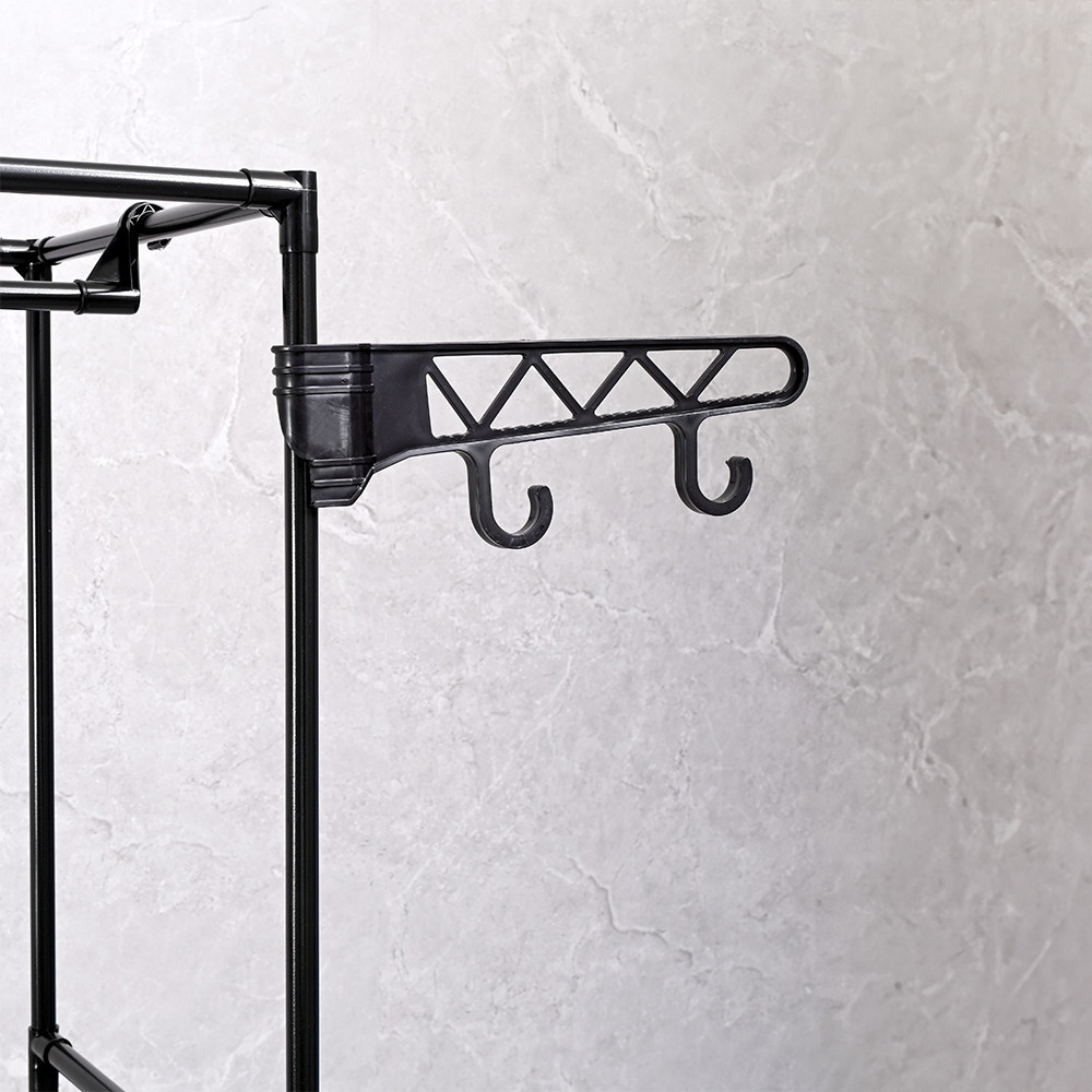 - Megnövelt funkcionalitás: A dupla akasztók mellett az állvány további polcokkal és fogantyúkkal rendelkezik, amelyek tovább növelik a funkcionalitást és lehetővé teszik a különböző tárgyak rendszerezését.