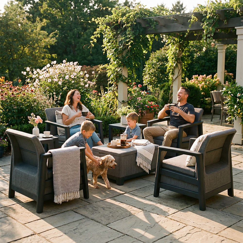 A szett kényelmes beszélgetősarkot alakít ki a kertben vagy a teraszon. Egységes, modern kültéri nappali hozható létre vele, miközben a tárolós asztal praktikus helyet biztosít a kiegészítőknek. Időjárásálló, gondozásmentes megoldás, amely rendezetten és átgondoltan formálja a kültéri teret.