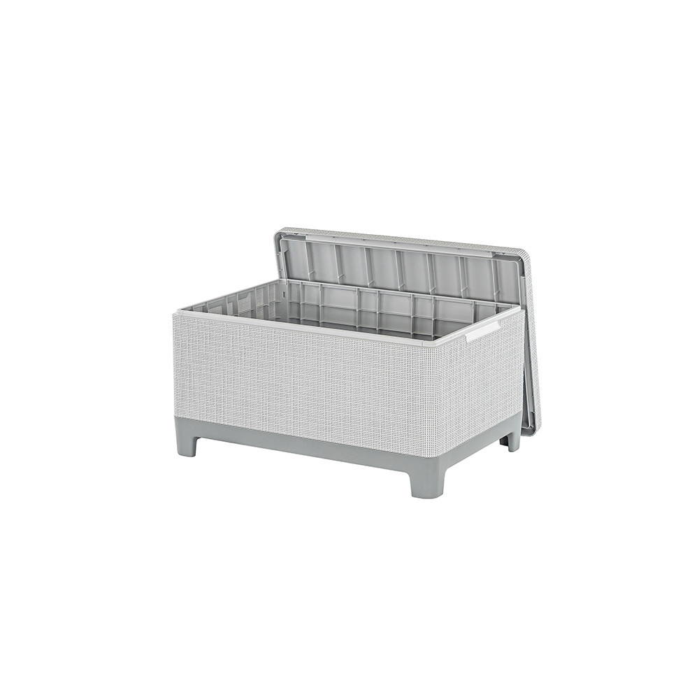 A modell egyik fő funkcionális eleme a zárt belső tárolótér, amely lehetőséget biztosít kisebb kiegészítők vagy használati tárgyak elhelyezésére. A tárolórekesz segíti a rendezett kültéri környezet kialakítását, miközben az asztallap továbbra is használható lerakófelületként. A tároló és az asztalfunkció kombinációja praktikus megoldást kínál olyan helyeken, ahol a helytakarékosság és az átgondolt kialakítás kiemelt szempont. Az asztal gyorsan és egyszerűen összeszerelhető, így rövid idő alatt használatba vehető.