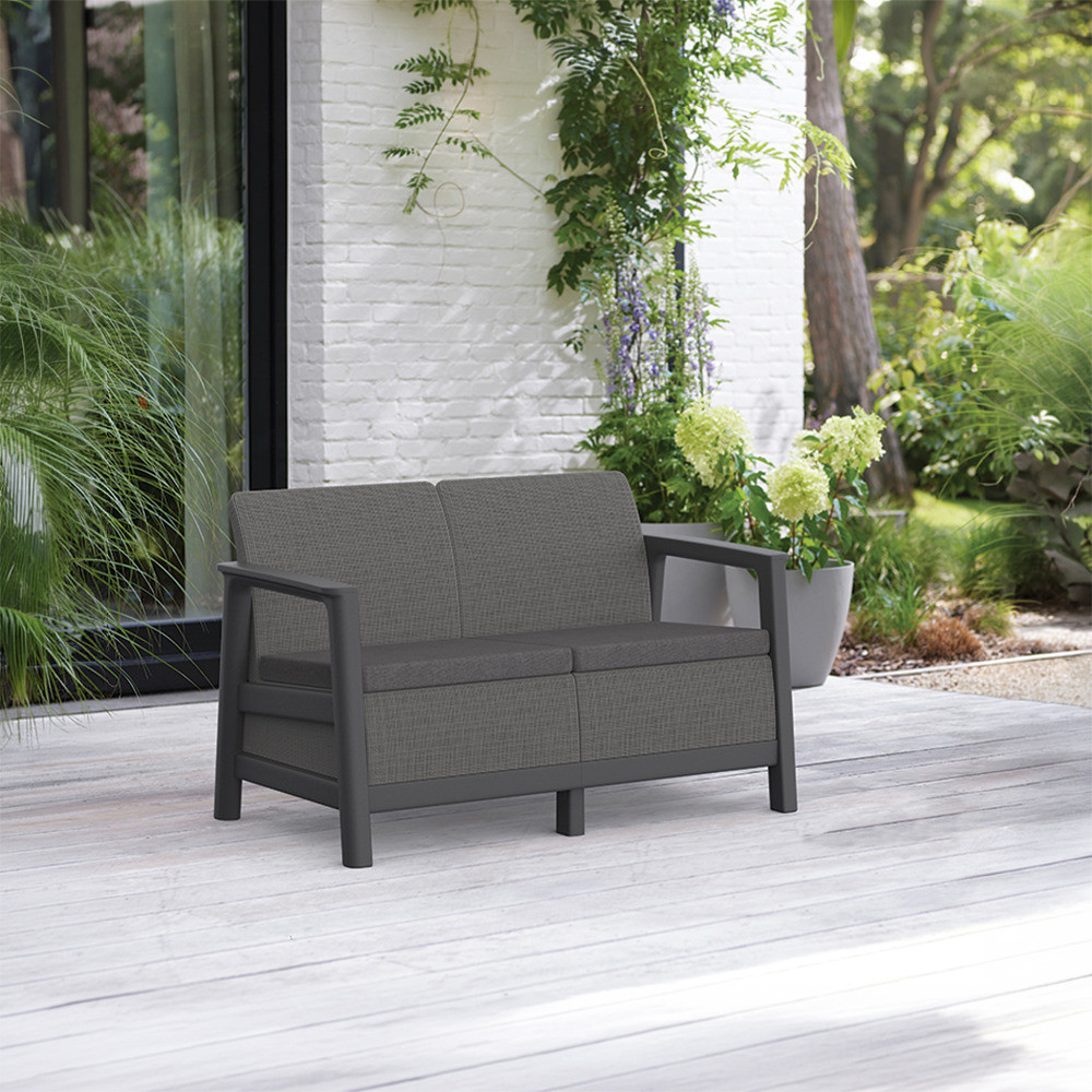 A Scandi linea 2 személyes kerti kanapé letisztult, egységes formavilágot képvisel. A grafit–hűvös szürke árnyalat texturált felület természetes megjelenést biztosít, amely jól illeszkedik zöld környezethez és modern kültéri burkolatokhoz. A két fotelből álló összeállítás harmonikus ülőhelyet teremt teraszon, kertben vagy tágas erkélyen, miközben a visszafogott színvilág könnyen kombinálható más Scandi elemekkel.