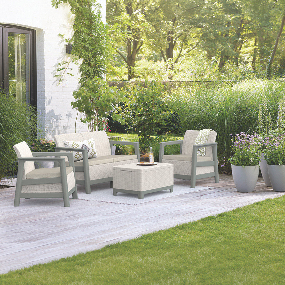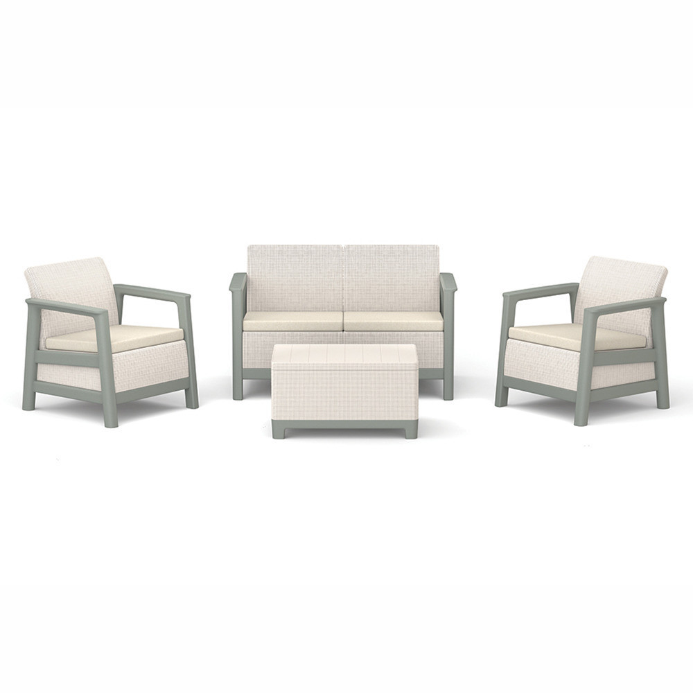 A szett kényelmes beszélgetősarkot alakít ki a kertben vagy a teraszon. Egységes, modern kültéri nappali hozható létre vele, miközben a tárolós asztal praktikus helyet biztosít a kiegészítőknek. Időjárásálló, gondozásmentes megoldás, amely rendezetten és átgondoltan formálja a kültéri teret.