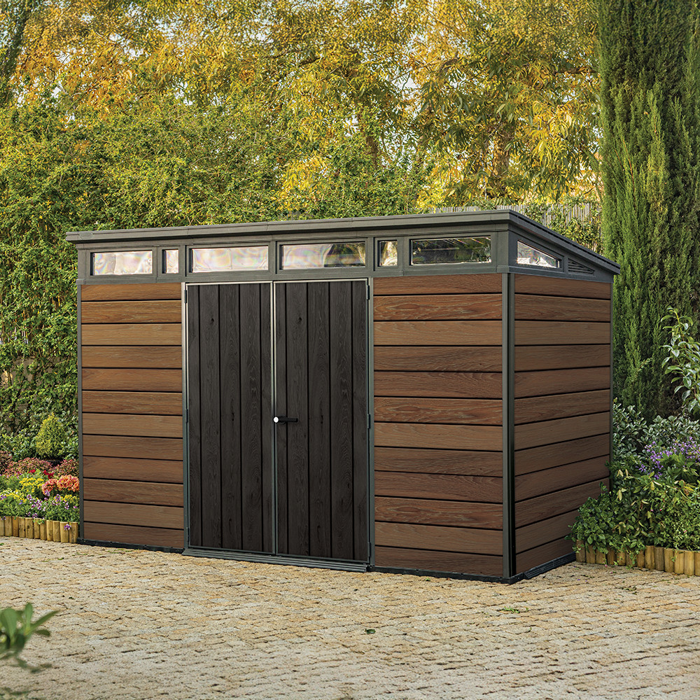 A Signature PENT 11x7 kerti ház ötvözi az esztétikát és a funkcionalitást. A ferde tető és letisztult vonalvezetés tökéletesen illeszkedik a modern kertépítési trendekhez, míg a dió színű DECOCOAT technológia időjárásálló felületet biztosít.