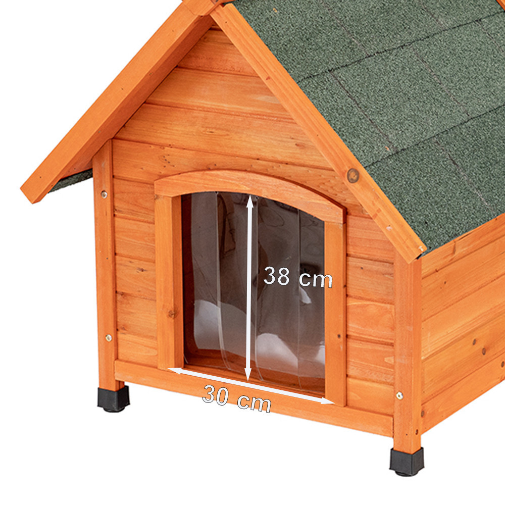 - Kialakítás: sátortetős, klasszikus fa kutyaház