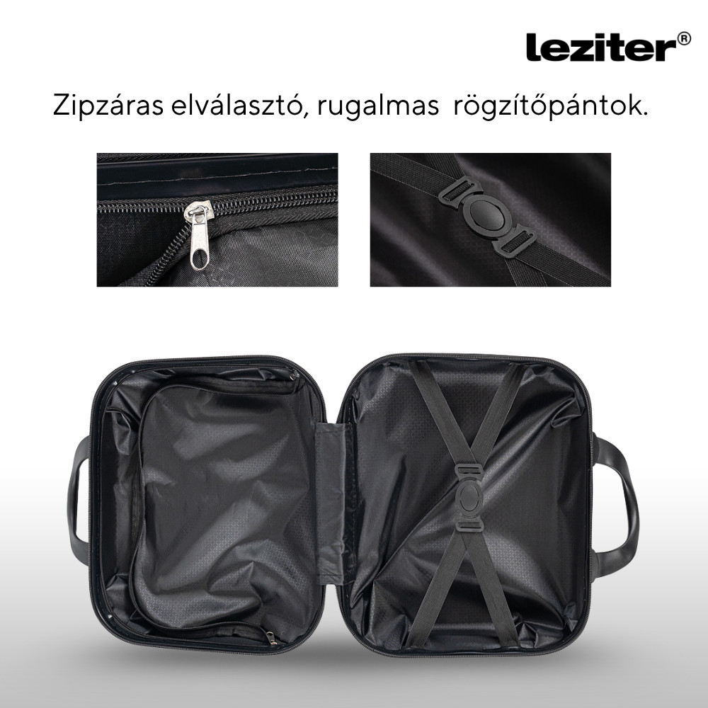 A Leziter TraveLux Pro neszeszer ideális választás rövidebb utazásokhoz, napi használatra vagy akár kézitáskaként is. Kompakt mérete ellenére jól pakolható, 10 literes űrtartalma pedig elegendő helyet biztosít a legfontosabb piperecikkeknek: kozmetikumok, neszesszeres flakonok, elektromos borotva, sminkfelszerelés vagy higiéniai kellékek is könnyedén elférnek benne. A letisztult formájával külön kézben hordva is stílusos, de nagyobb bőröndre rögzítve is maximálisan praktikus.