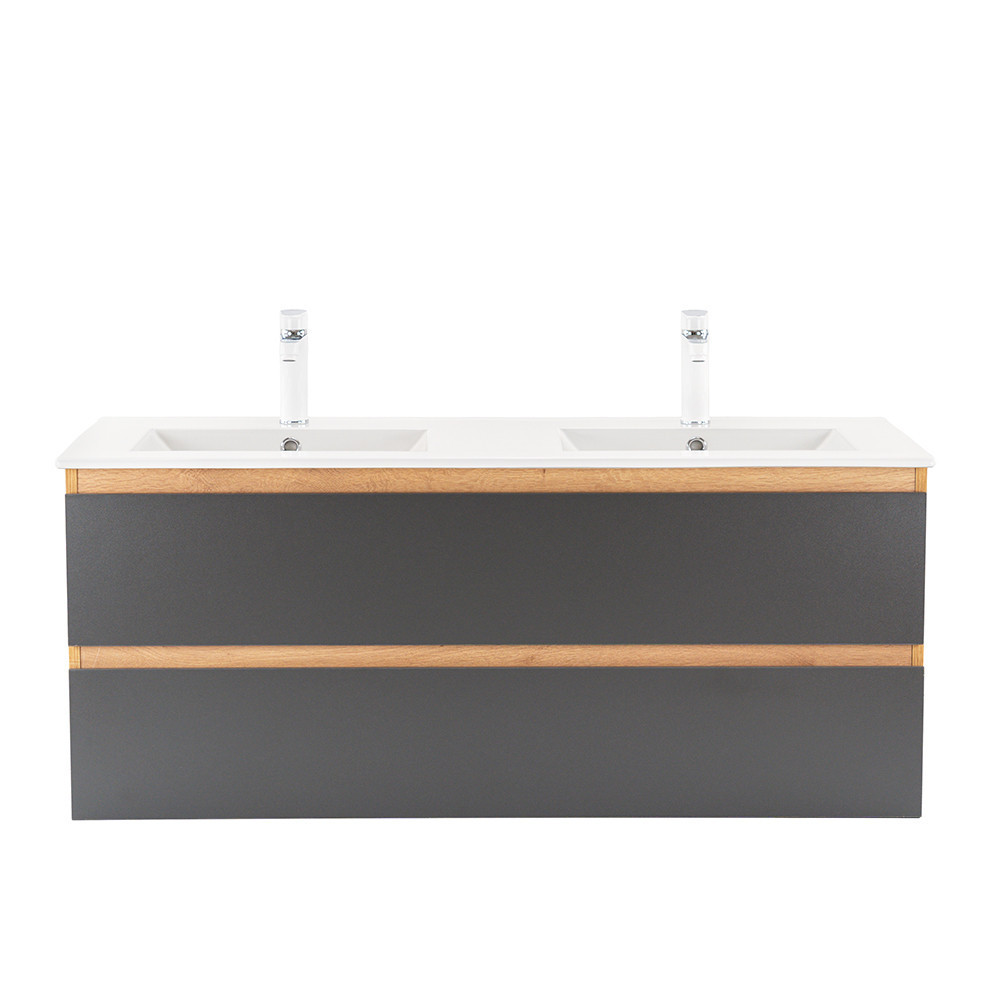- Elegáns és praktikus mosdó: A bútor flat design kerámia mosdóval érkezik, amely kétmedencés kivitelű. Modern, esztétikus és könnyen tisztítható.