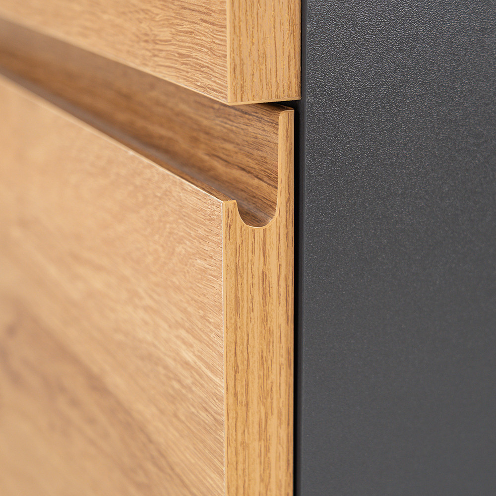 Az antracit korpusz és a tölgy front kombinációja elegáns és időtálló megjelenést kölcsönöz a bútornak.