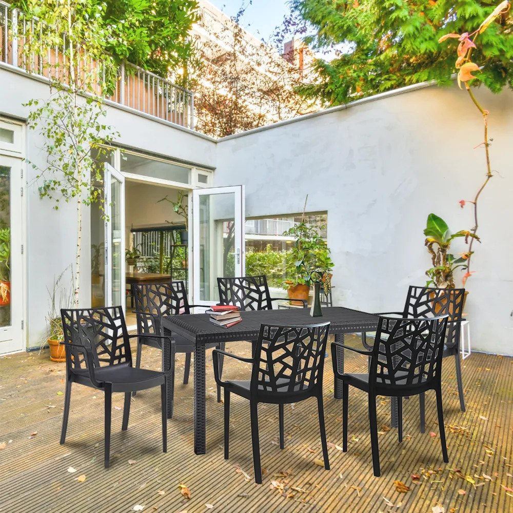 Olaszországban készült ez a grafit színű, kényelmes és elegáns bútor szett. hat 55x 58x 82cm-es széket és egy 150x 90x 74 cm-es négyszögletes magas asztalt foglal magába.