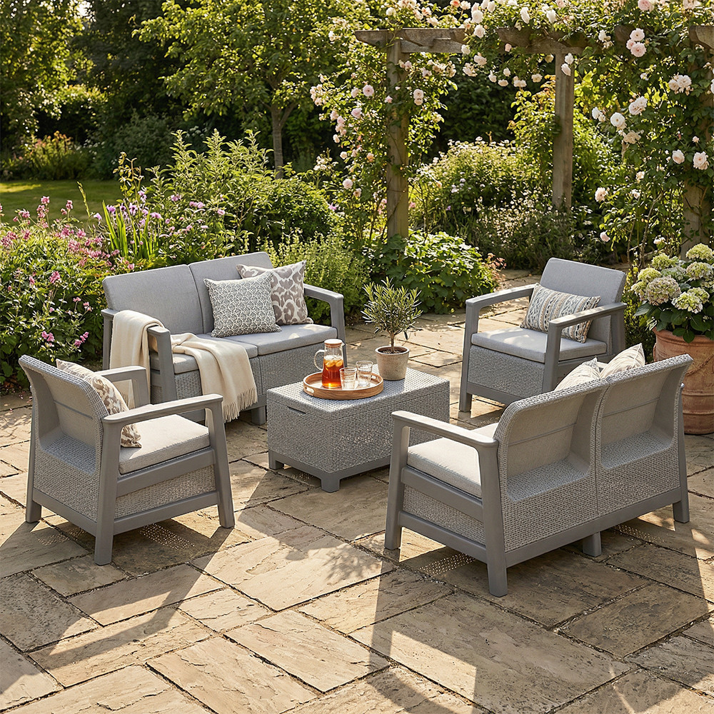Ideális választás azok számára, akik hamuszürke-világosszürke kerti bútor szettet keresnek, időjárásálló műanyag kültéri bútort szeretnének, kisebb teraszra vagy erkélyre is elhelyezhető kompakt megoldást választanának, illetve előnyben részesítik a tárolóval ellátott kerti asztalt. Stabil, modern és hosszú távon is kényelmes kültéri ülőgarnitúra.
