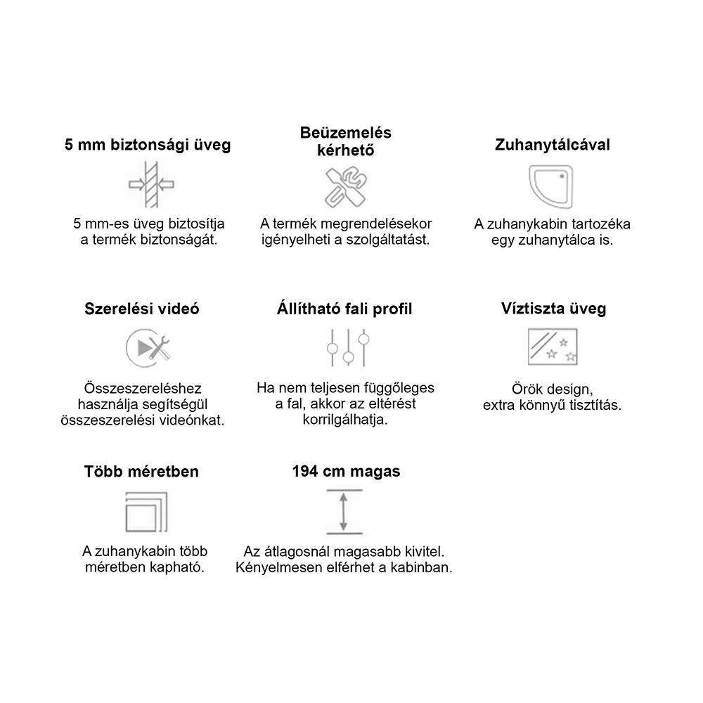 - Magasság: 180 cm (kabin), 194 cm zuhanytálcával együtt