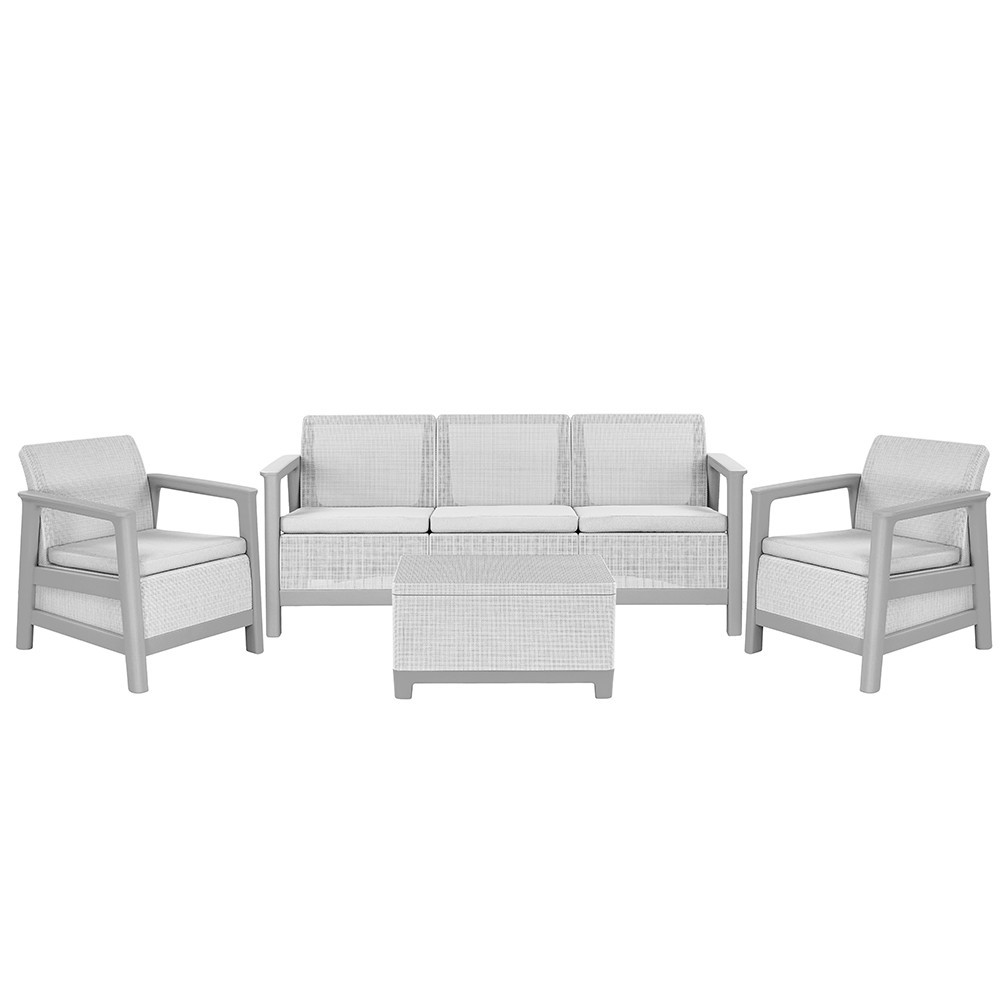 A szett kényelmes beszélgetősarkot alakít ki a kertben vagy a teraszon. Egységes, modern kültéri nappali hozható létre vele, miközben a tárolós asztal praktikus helyet biztosít a kiegészítőknek. Időjárásálló, gondozásmentes megoldás, amely rendezetten és átgondoltan formálja a kültéri teret.